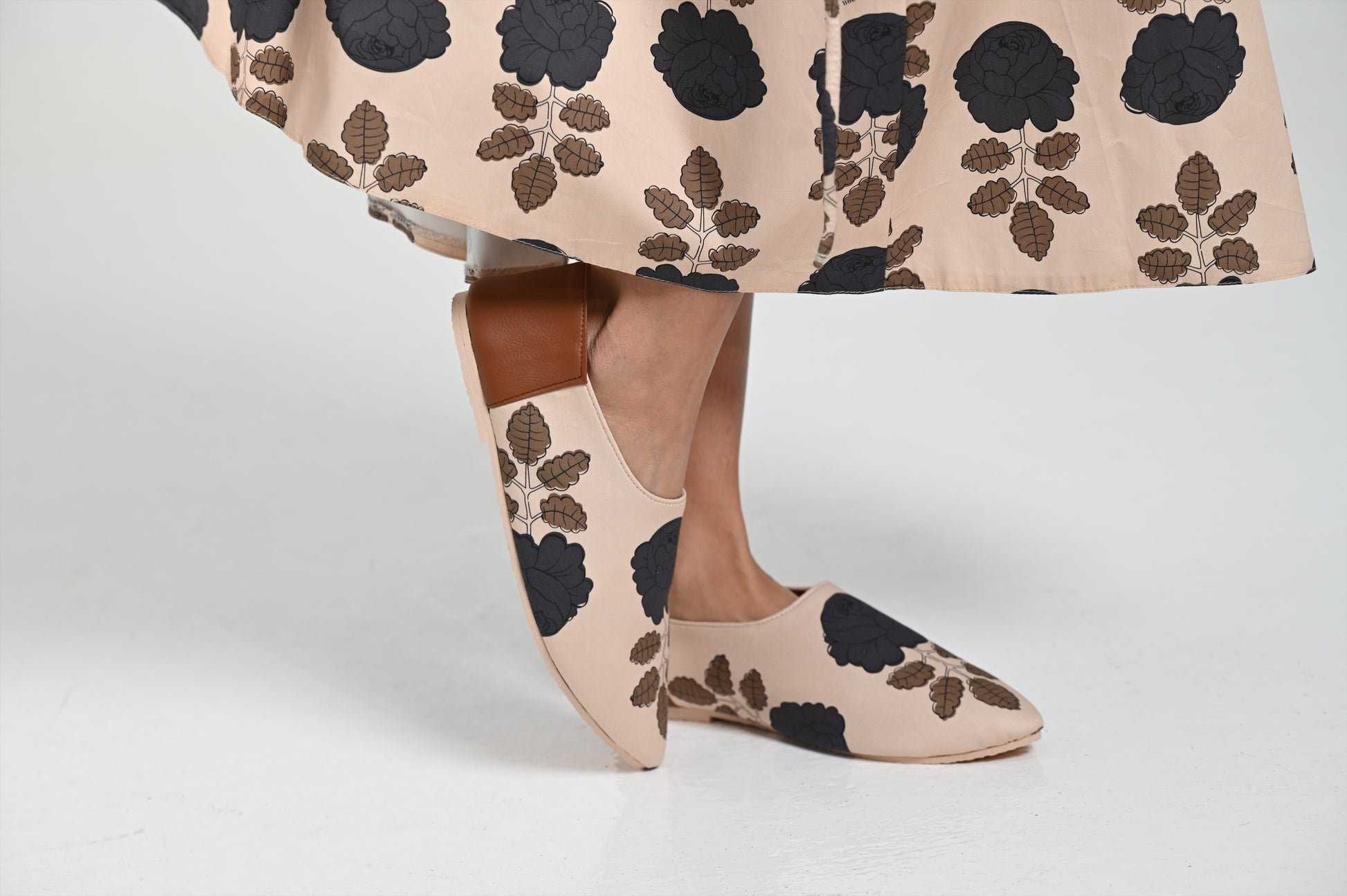 حذاء مسطّح أنثوي بتصميم مريح وأنيق باللون البيج الفاتح، تتزيّنه نقوش أزهار كبيرة باللون الأسود والبني لتمنحه طابعًا فنيًا راقٍ. الجزء الخلفي من الحذاء مصنوع من جلد باللون البني الدافئ، مما يضيف لمسة فخمة ويعزّز من ثبات الحذاء وأناقة مظهره.