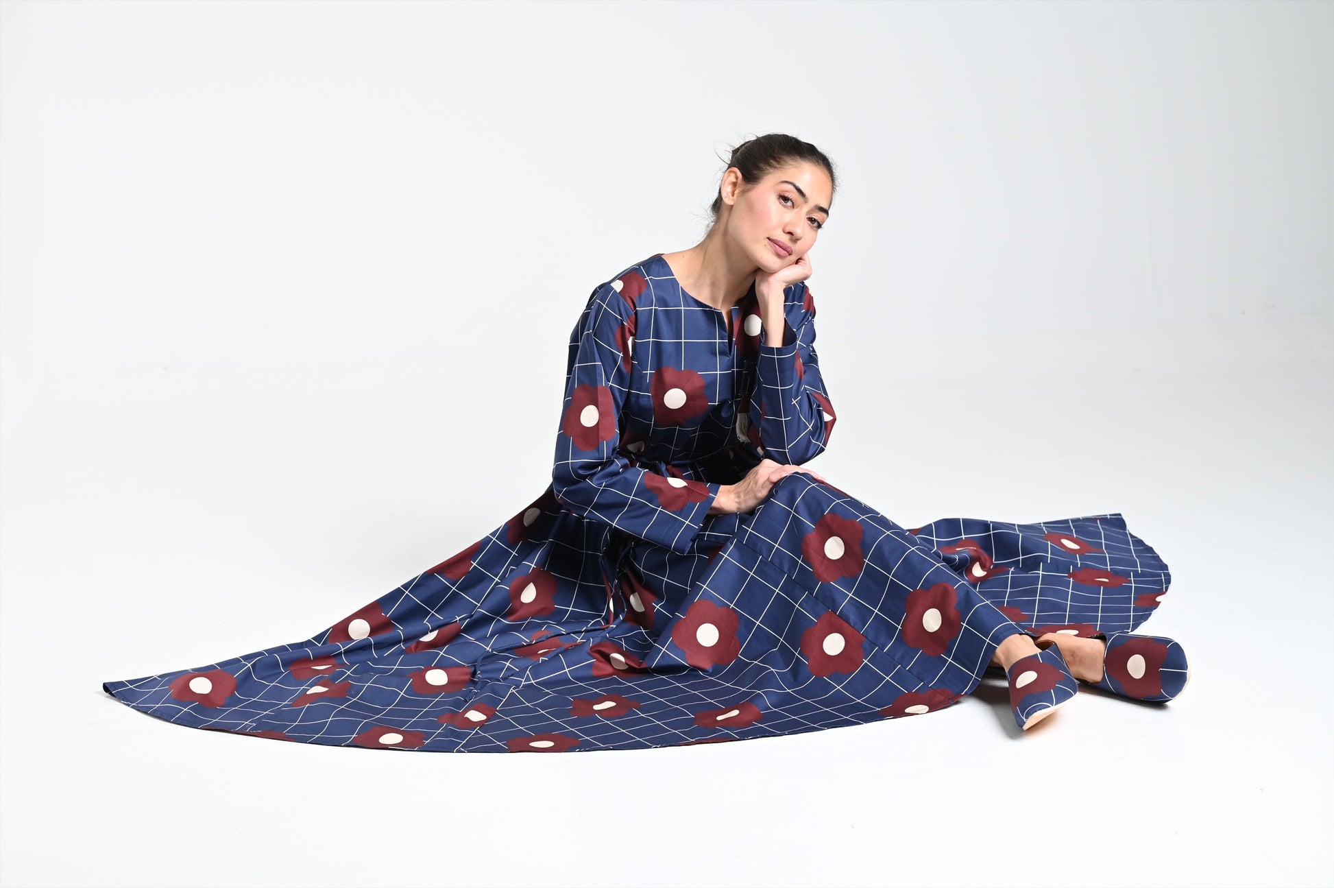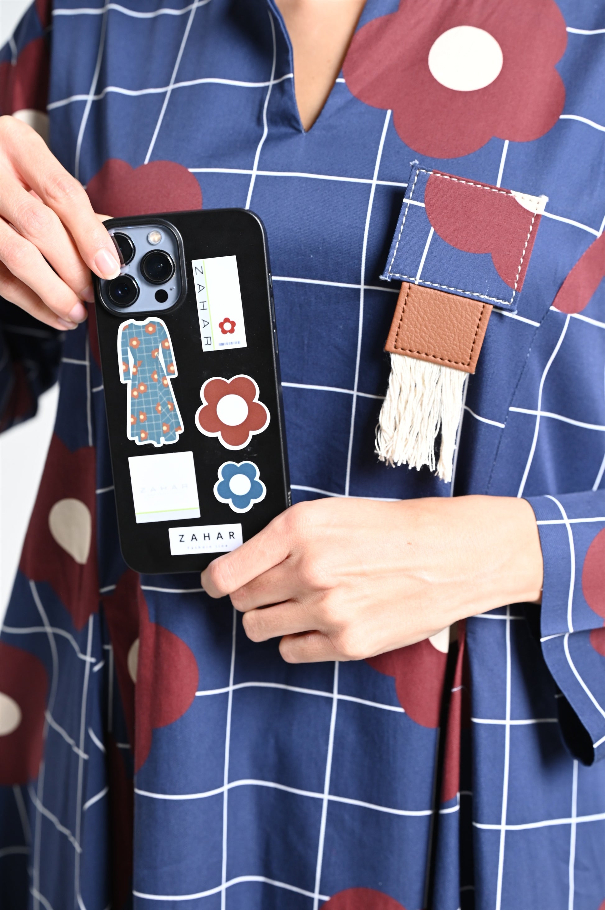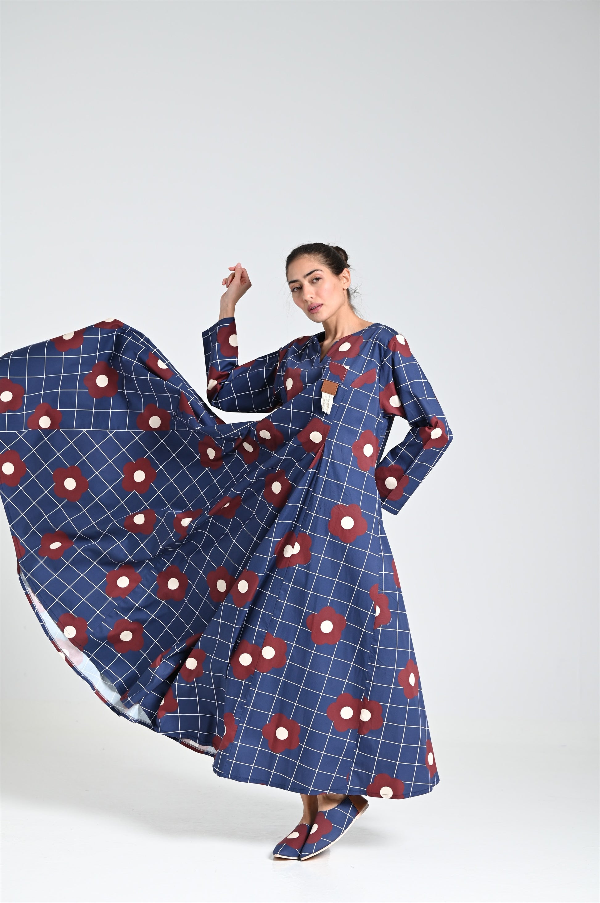 - اللون: كحلي (أزرق داكن) مع نقشات زهور عنّابية وبيضاء