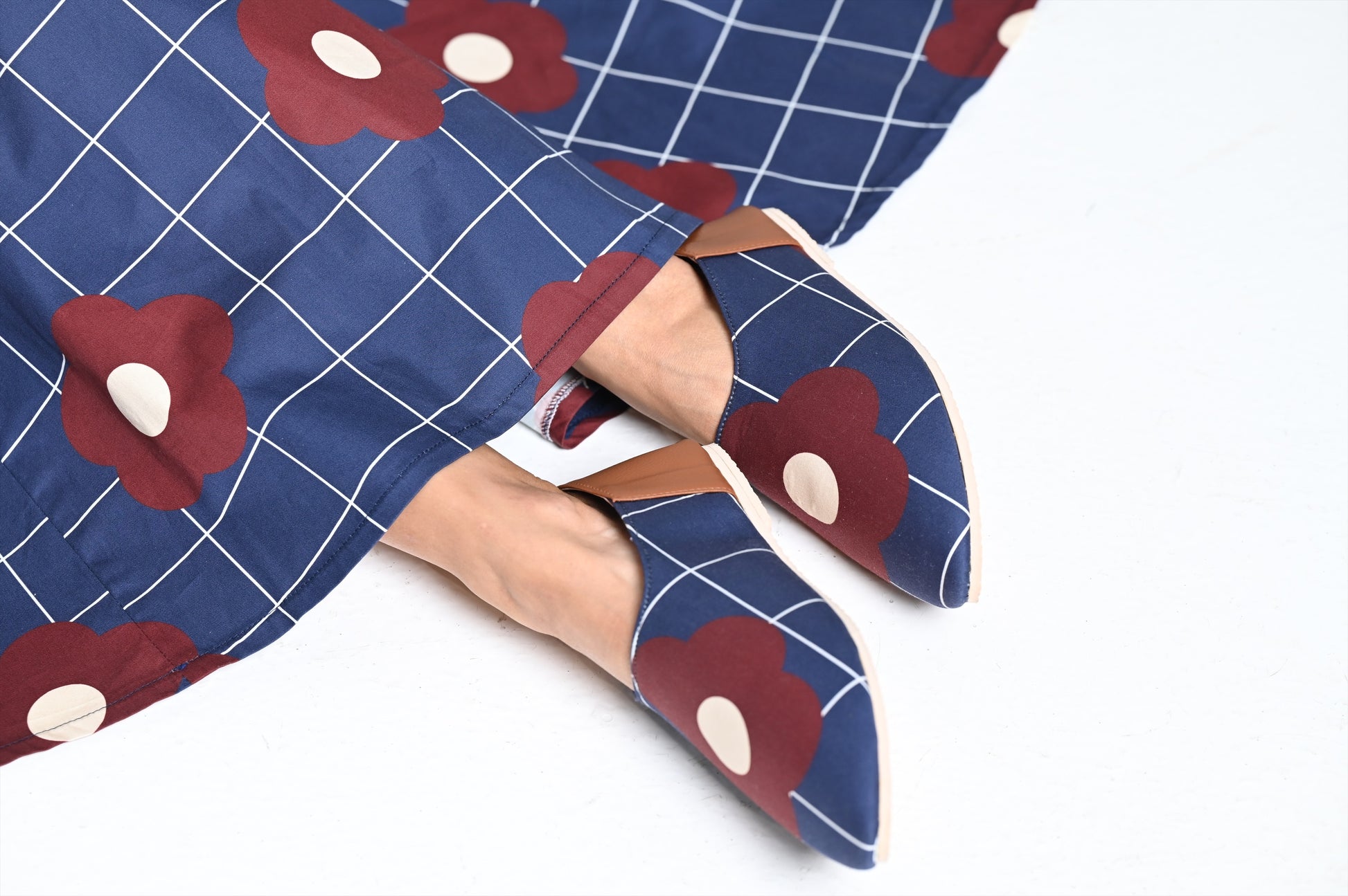 حذاء أنثوي أنيق يجمع بين الطابع الفني واللمسة العصرية. يتميّز بتصميمه المسطّح المريح باللون الكحلي الغامق مع نقشة أزهار كبيرة باللون العنّابي الداكن ومراكز بلون عاجي فاتح، موزعة بتناغم على خلفية مزينة بخطوط بيضاء متقاطعة تمنحه طابعًا هندسيًا أنيقًا.
