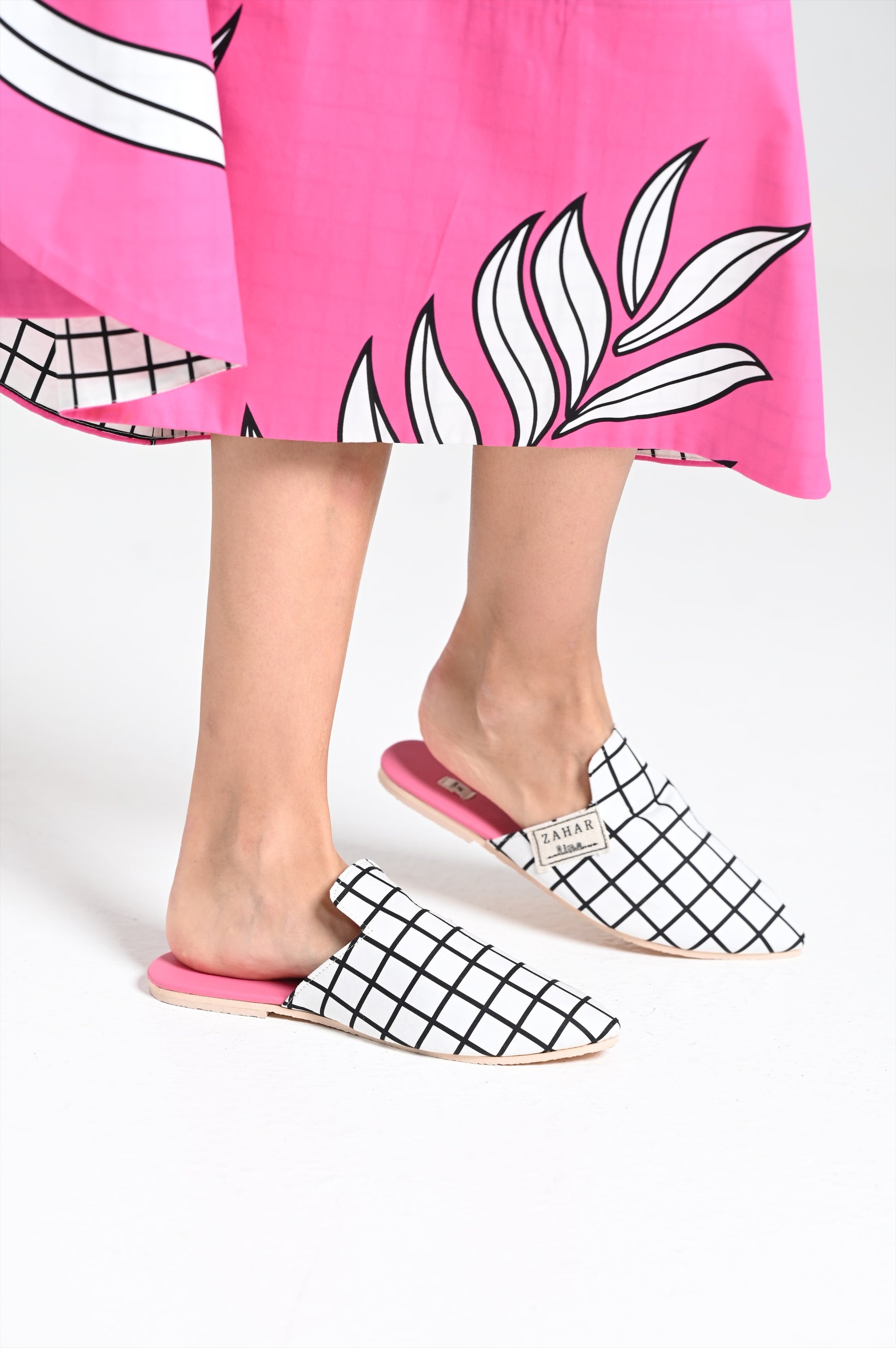 حذاء مسطّح بنقشة مربعات عصرية باللونين الأبيض والأسود