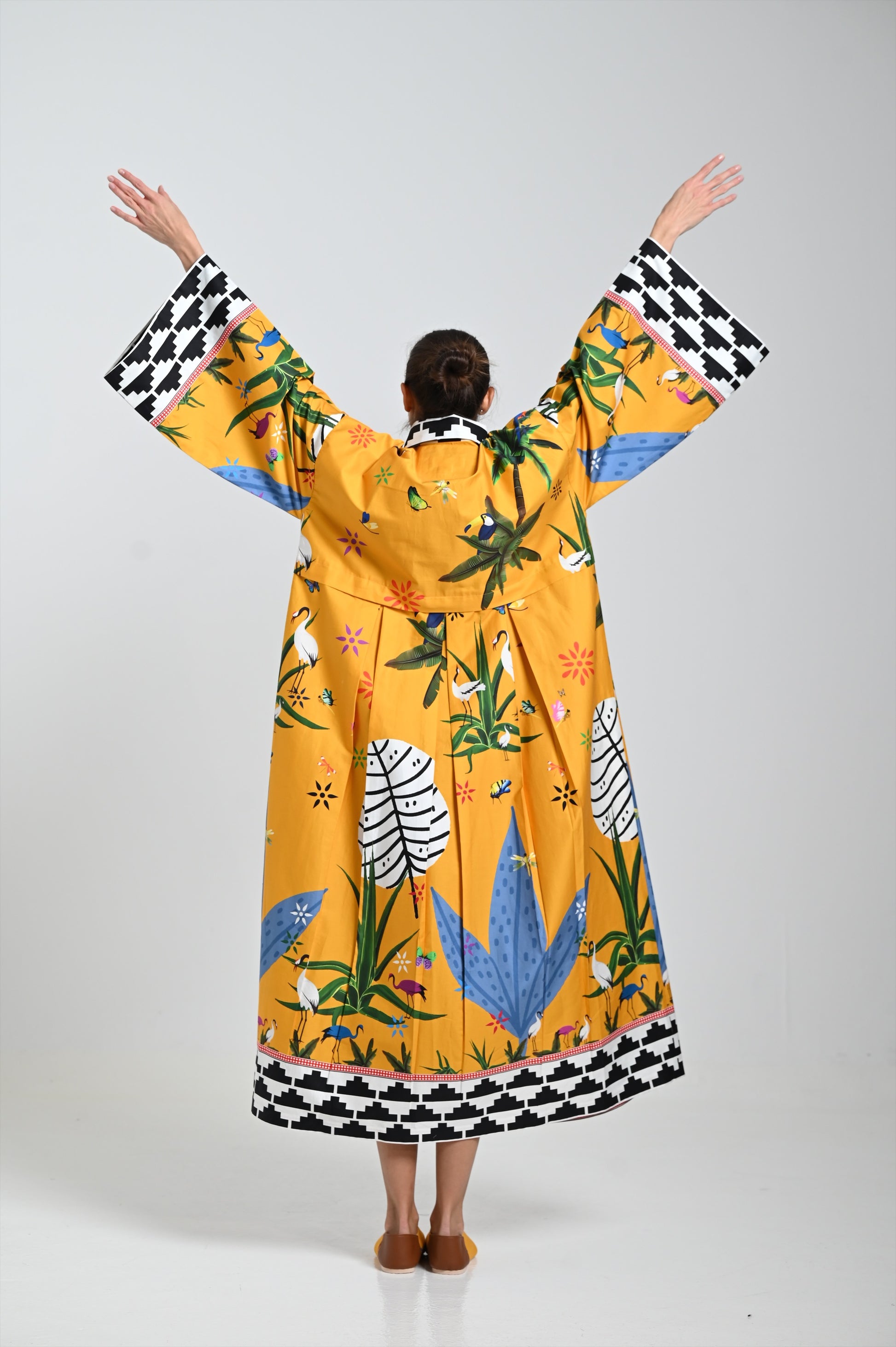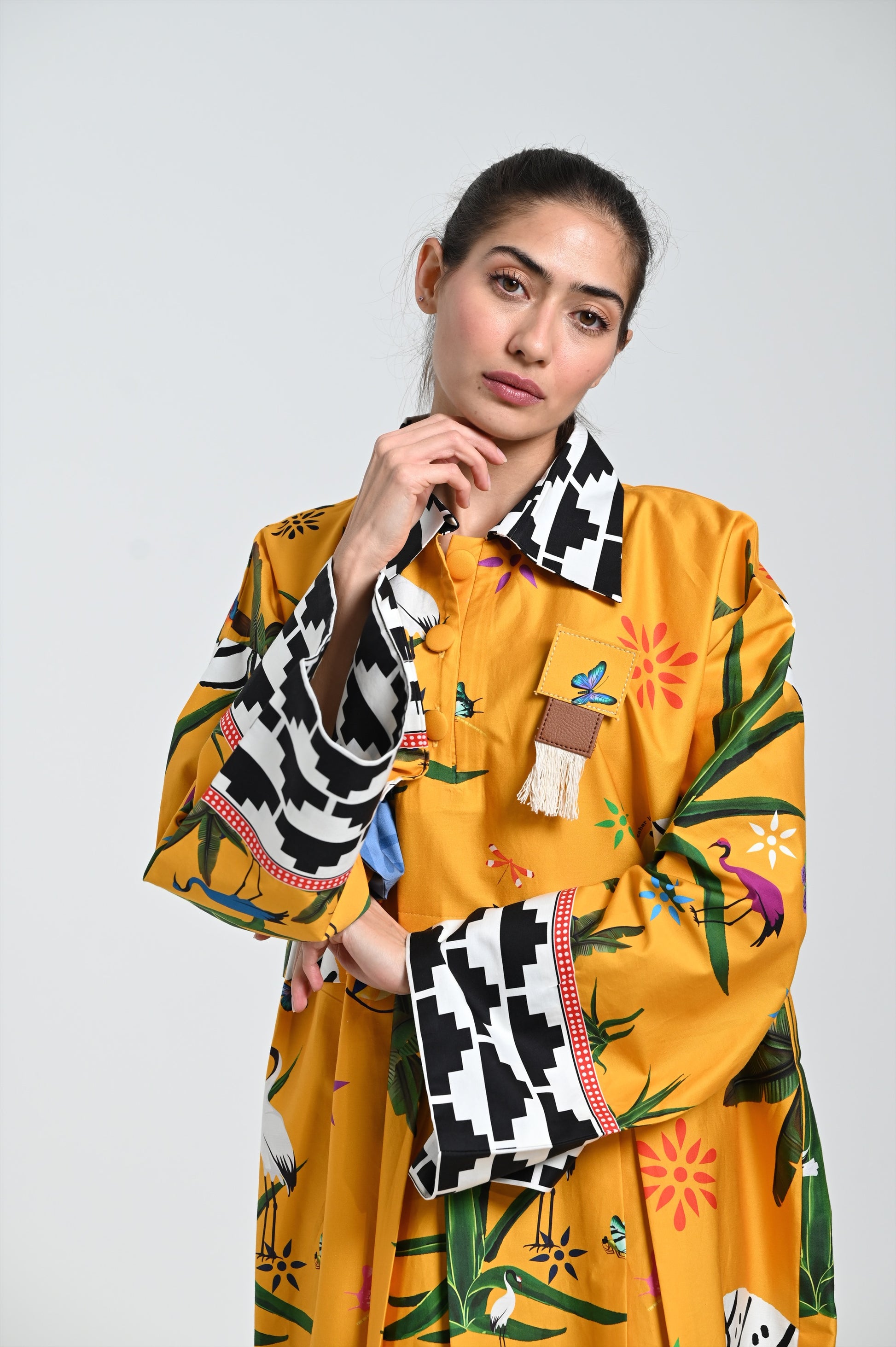 • الأكمام: طويلة وواسعة بتصميم هندسي عند الأطراف