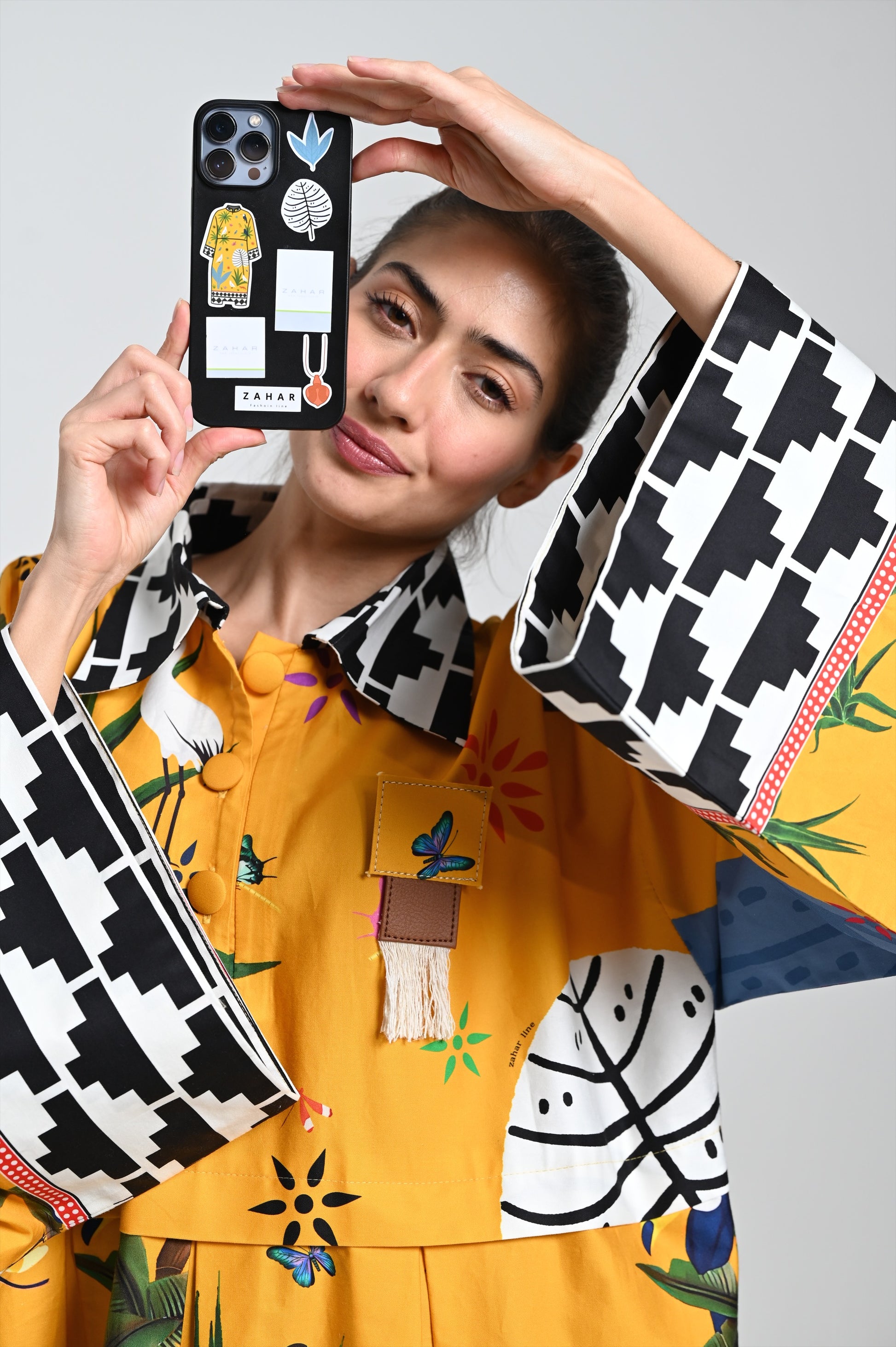 • النقشة: رسومات نباتية وفنية بألوان متعددة (أزرق، أبيض، أسود على خلفية مرجانية)