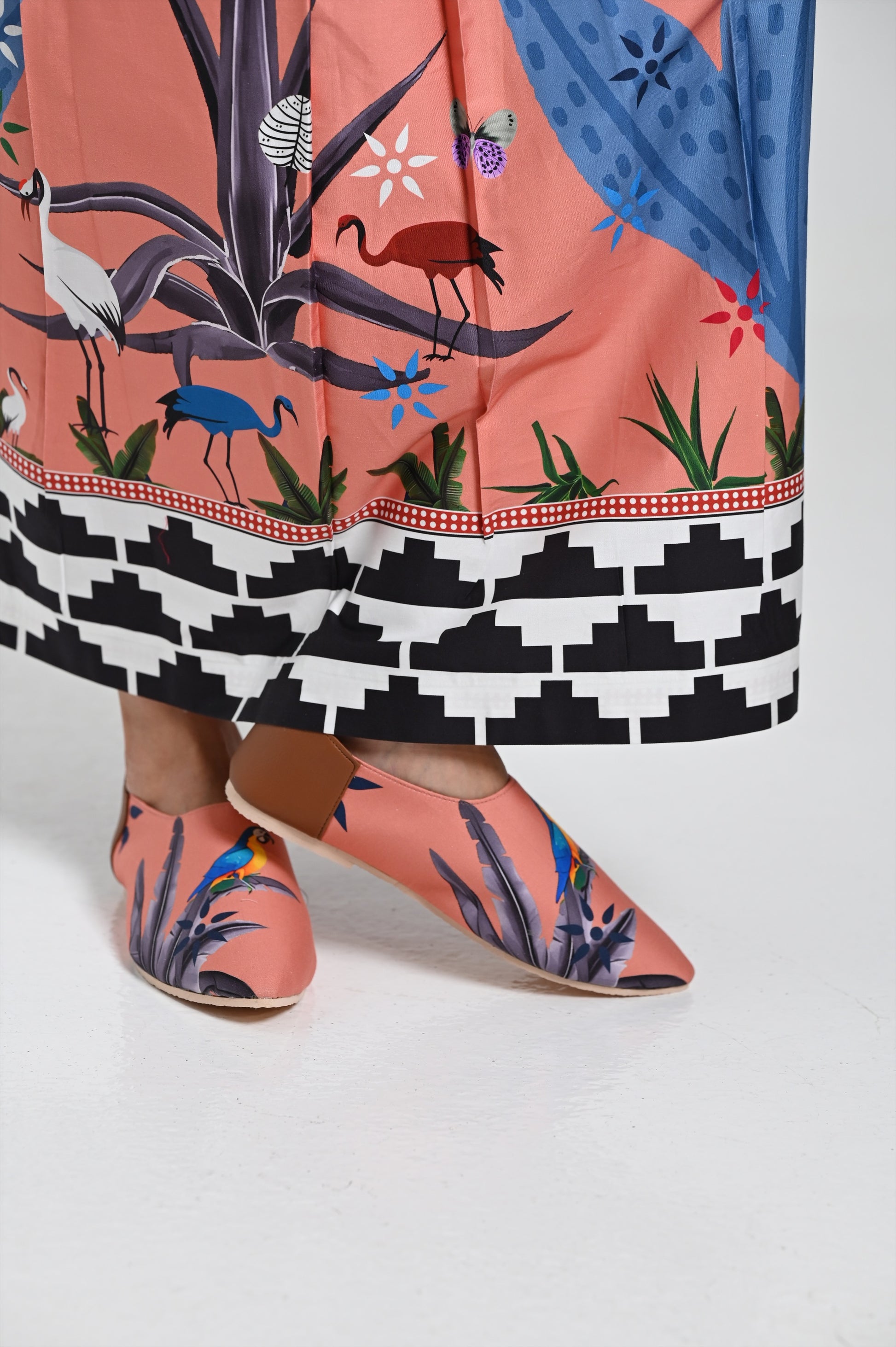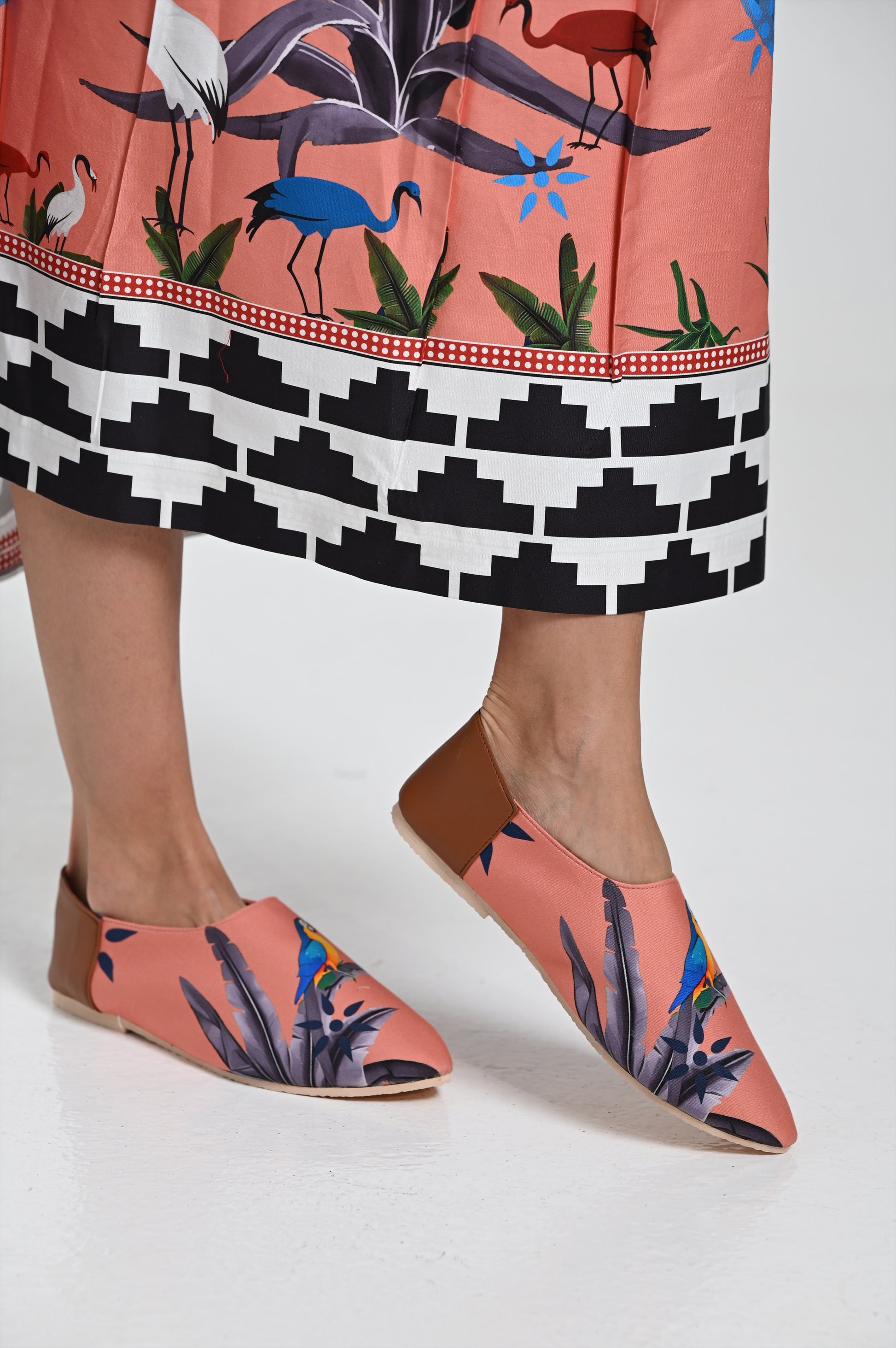 حذاء مسطّح باللون المرجاني الوردي الدافئ، مزين برسومات لببغاء ملون بألوان الأزرق والأصفر يقف على أغصان نباتية بدرجات الرمادي والبنفسجي. التصميم يحمل طابعًا استوائيًا عصريًا يمنح الحذاء مظهرًا فنيًا مميزًا وجاذبية بصرية لافتة.